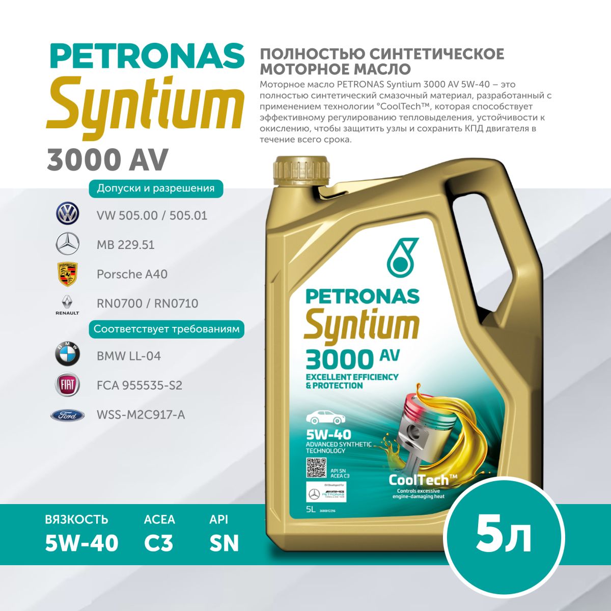 Моторное масло PETRONAS Syntium 3000 AV 5W-40 – это полностью синтетический смазочный материал, разработанный с применением технологии °CoolTech™, которая способствует эффективному регулированию тепловыделения, устойчивости к окислению и предотвращению разложения масла с образованием осадка, чтобы защитить узлы и сохранить КПД двигателя в течение всего срока замены масла.