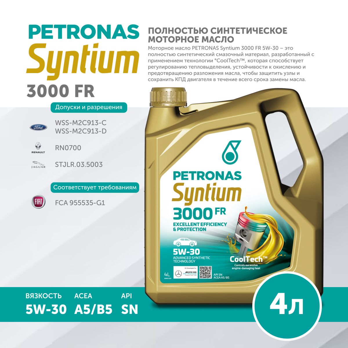 Моторное масло PETRONAS Syntium 3000 FR 5W-30 – это полностью синтетический смазочный материал, разработанный с применением технологии °CoolTech™, которая способствует эффективному регулированию тепловыделения, устойчивости к окислению и предотвращению разложения масла с образованием осадка, чтобы защитить узлы и сохранить КПД двигателя в течение всего срока замены масла.