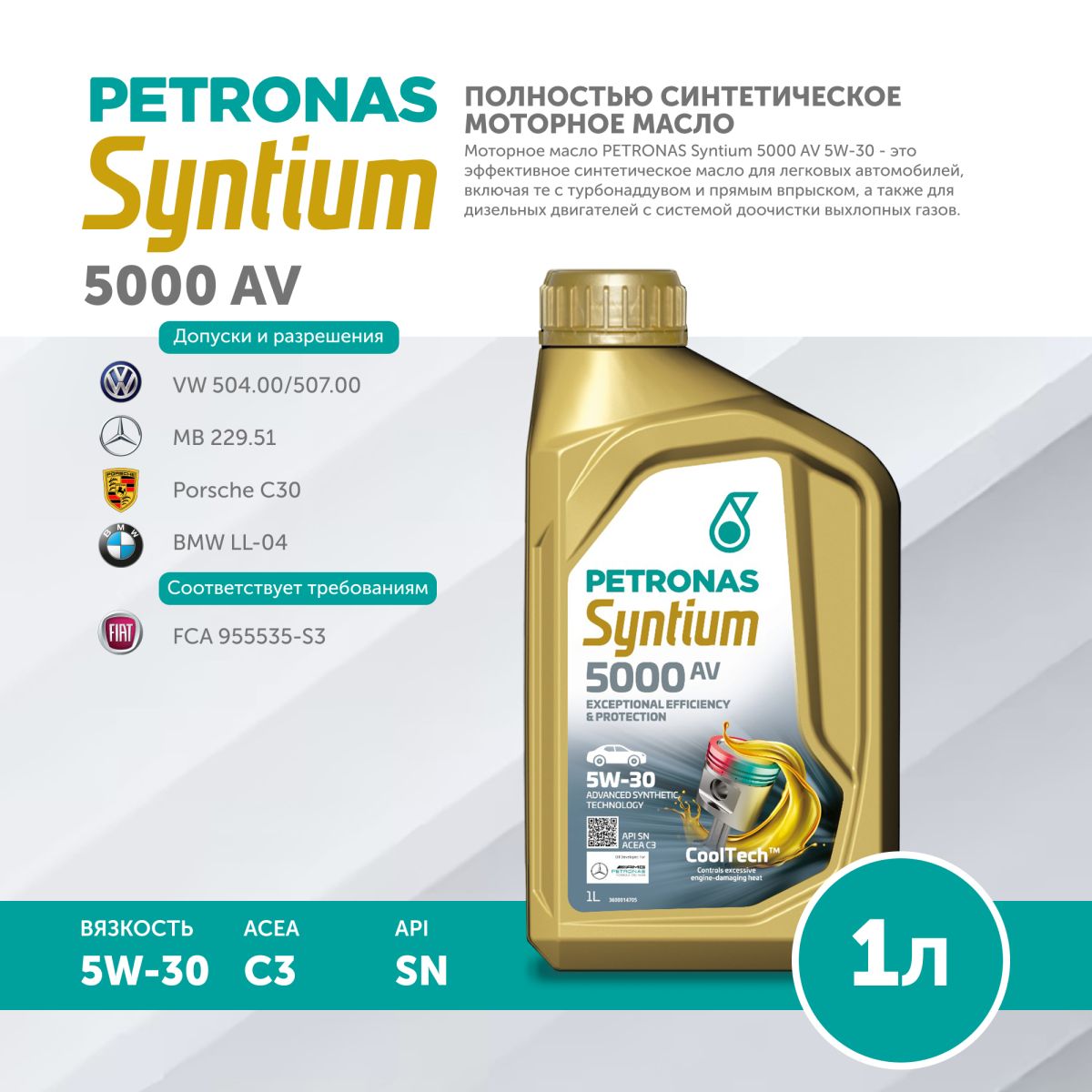 PETRONAS Syntium 5000 AV 5W-30 SN — полностью синтетический смазочный материал, созданный с использованием технологии °CoolTech™ для борьбы с перегревом двигателей. °CoolTech™ действует на участках, особенно подверженных нагреву — внутренних частях двигателя, подверженных воздействию высоких температур — для поглощения и передачи избыточного тепла и регулирования температуры двигателя, тем самым защищая его важные компоненты от повреждений и потери производительности.