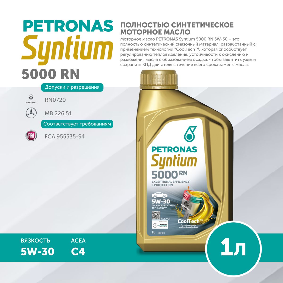 Моторное масло PETRONAS Syntium 5000 RN 5W-30 – это полностью синтетический смазочный материал, разработанный с применением технологии °CoolTech™, которая способствует эффективному регулированию тепловыделения, устойчивости к окислению и предотвращению разложения масла с образованием осадка, чтобы защитить узлы и сохранить КПД двигателя в течение всего срока замены масла.