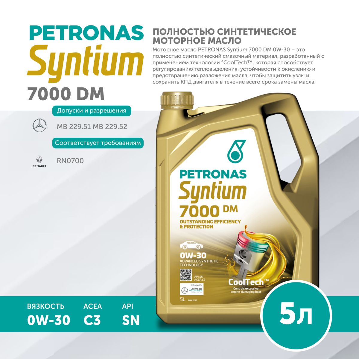 Моторное масло PETRONAS Syntium 7000 DM 0W-30 – это полностью синтетический смазочный материал, разработанный с применением технологии °CoolTech™, которая способствует эффективному регулированию тепловыделения, устойчивости к окислению и предотвращению разложения масла с образованием осадка, чтобы защитить узлы и сохранить КПД двигателя в течение всего срока замены масла.