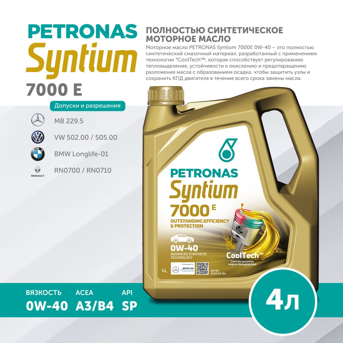 Моторное масло PETRONAS Syntium 7000E 0W-40 – это полностью синтетический смазочный материал, разработанный с применением технологии °CoolTech™, которая способствует эффективному регулированию тепловыделения, устойчивости к окислению и предотвращению разложения масла с образованием осадка, чтобы защитить узлы и сохранить КПД двигателя в течение всего срока замены масла.